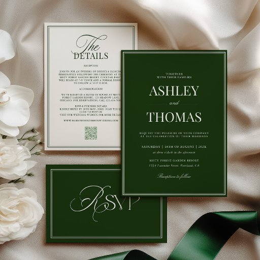 Refined, timeless, and effortlessly elegant, this wedding invitation features a rich old-money dark green paired with a soft ivory background, inspired by heirloom stationery and European tradition. The clean typography and classic border design evoke understated luxury—perfect for couples drawn to heritage style, quiet sophistication, and enduring romance.