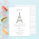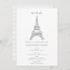 Une invitation à la douche nuptiale élégante, design et minimaliste sur le thème parisien, avec une tour Eiffel recouverte de strass (effet numérique), une typographie simple et de délicates rayures dessinées à la main à l'arrière.