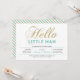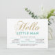 Célébrez une journée spéciale pour votre bien-aimé avec cette invitation baby shower moderne! Ce design présente une typographie stylisée "Hello Little Man" en parties scintillant or texture & couleur menthe thème.