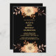 Une invitation d'anniversaire classe et élégante avec une fleur d'orange et un arrangement feuille marron avec typographie or moderne sur un arrière - plan noir.