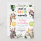 Orange Green Ballons Safari Party Animaux Anniversaire Invitation Girls n'importe quel âge safari invitation d'anniversaire thématique avec quatre animaux de la jungle, casquettes de fête, ballons et feuillage tropical. Cette invitation à l'anniversaire, thématique safari, comporte également un mot multicolore.