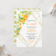 This fun and whimsical birthday party invitation features watercolor oranges, daisies and foliage on a gold geometric frame. The text combines handwritten script and serif fonts for a stylish and modern look. This is perfect for a summer rustic birthday party.