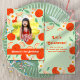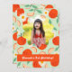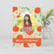 Une invitation amusante à la fête d'anniversaire comprend des oranges dansantes et des marguerites avec une photo préférée dans un cadre de forme florale.