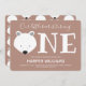 Notre petit ours est en train de lancer une première invitation d'anniversaire de naissance. Cette invitation est brun clair et blanc avec le mot "One" en grandes lettres avec une illustration de visage d'ours blanc polaire comme première lettre du mot. Simplement, customisez cette invitation, ajoutez-la à votre panier, et joyeux anniversaire à votre merveilleux bébé! Ours Polaire Turner un animal mignon Premier anniversaire Invitation Jours fériés Conception | ©Melissa Patton - Artiste/Illustrateur