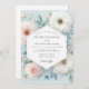 Ethereal pale blue tones mingle with delicate blush and creamy white blossoms, creating a dreamy, romantic atmosphere. Soft greenery accents the artistic floral arrangement, evoking a sense of serene elegance. This design whispers of gentle celebrations and airy, lighthearted festivities.