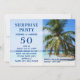 Invitations de fête d'anniversaire de palmiers tropicaux pour un adulte. L'arrière - plan est une scène tropicale avec un grand palmier penché sur une mer calme. Tout le texte est bleu vif et se trouve sur le côté gauche des cartes horizontales. Seul le texte RSVP se trouve sous le palmier. L'exemple de libellé est pour l'anniversaire surprenant d'un homme, mais fonctionne aussi pour une femme. Échanger "surprise" pour "anniversaire" si votre fête n'est pas une surprise.
