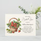Invitation à la douche nuptiale avec une jolie illustration de fraises fraîches en bois remplissant un pittoresque panier en osier.