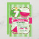 Mignonne pastèque rose et vert, enfant d'été, garçon ou fille invitation à la fête d'anniversaire sur vert clair et blanc rayures arrière - plan motif. Personnalisez ce mignon invitation avec le nom de votre enfant. Comprend une bougie de 7e, 7e anniversaire qui peut être personnalisée selon l'âge de votre enfant. Parfait pour l'anniversaire de naissance, le tout-petit, les jeunes enfants ou les enfants plus âgés. Grand invitation pour la pastèque, les fruits, la nourriture d'été thème fête d'anniversaire.