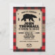 Un fond de plaid buffalo rouge contraste avec un panneau d'aspect papier kraft maintenu par une sangle en jute sur cette invitation sur le thème des Northwoods. Le panneau contient les informations de la fête avec un ours entre deux pins. La hache croisée crée un logo personnalisé en dessous. Idéal pour un anniversaire, une soirée d'enterrement de vie de garçon, un événement saisonnier ou une célébration sur le thème du plaid buffalo ou du bûcheron. Disponible avec des produits assortis.