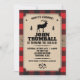 Un fond de plaid buffle rouge contraste avec un panneau d'aspect papier kraft maintenu par une sangle en toile de jute sur cette invitation sur le thème des Northwoods. Le panneau contient les informations sur la fête avec un élan entre deux pins. La hache croisée crée un logo personnalisé en dessous. Idéal pour un anniversaire, une soirée d'enterrement de vie de garçon, un événement saisonnier ou une célébration sur le thème du plaid buffle ou du bûcheron. Disponible avec des produits assortis.