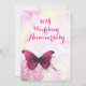 Une invitation d'anniversaire de mariage élégante et sophistiquée. Le design de l'invitation est un beau papillon peint en violet. Sur un fond délicat qui a une texture d'aquarelle unique et créative avec des fleurs fanées roses et jaunes romantiques. Avec un logo antique faiblement visible en bas pour lui donner un certain charme vintage
