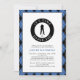 Masculine golf anniversaire de fête sur mesure design dispose d'une silhouette de golfeur masculin en noir classique sur une forme blanche bordée d'un texte courbe humoristique "It's Time To Par Tee!" en police blanche sur un cercle noir. Customisez le modèle avec le nom et les détails en lettres noires et bleues royales classiques. L'invitation est bordée d'un classique plaid de style Jacquard noir & bleu royal qui se répète également à l'arrière de l'invitation.