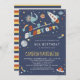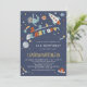 Refroidissez l'invitation espace-orientée de fête d'anniversaire comportant un astronaute de paresse flottant parmi des étoiles filantes, des planètes, et des vaisseaux spatiaux !
