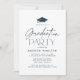 Invitations modernes de remise de diplômes avec une casquette noire en haut de la conception avec "Graduation Party" affiché dans la typographie de script de la marine sur un arrière - plan blanc. Personnalisez l'invitation minimaliste à la remise des diplômes avec le nom du diplômé et les détails du parti. L'invitation de la cérémonie de remise des diplômes de la Marine est parfait pour célébrer les diplômés du secondaire et du collège.