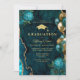 Elegant Gold Turquoise Agate Photo Graduation Party Invitation présente de belles teintes bleues turquoises de ballons festifs, géode en pierre de gemme et fines florales roses turquoise avec des taches d'or et de bouchon de graduation. Retrouvez une photo préférée de la grade au dos de l'invitation à la remise des diplômes.