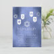 Invitation de fête Hanoukka moderne avec des dreidels blancs pendants et Star of Davids sur un arrière - plan de livre bleu.