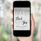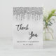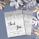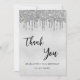 Un carte de remerciements pour un 50ème anniversaire (ou tout âge). Une couleur arrière - plan à l'aspect métallique faux argenté. Avec des gouttes de fausse parties scintillant, la peinture goutte à goutte. Sur le devant, un script écrit à grande main et le texte : Merci, votre texte, titre et une date. Retour : Modèle pour Votre mot de remerciement et nom.