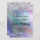 Une élégante invitation à l'anniversaire d'une étape monogrammée pour elle. Parties scintillant argent Faux avec étincelles contre un arc-en-ciel irisé couleur ombre faux brossé feuille métallique image graphique. On peut customiser le monogramme de calligraphie noir et blanc de fantaisie. Tous les éléments scintillants, brillants, brillants et argentés de ce design moderne sont des graphismes numériques.