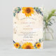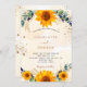Un arrière - plan blanc et doré décoré de tournesols, de verdure d'eucalyptus et de feuilles dorés et de poussière de parties scintillant en faux or. Personnalisez et ajoutez vos noms et les détails de votre fête.