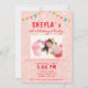 Parties scintillant rose mignonne Fille Anniversaire Fête Photo Invitation. Belle et amusante invitation d'anniversaire pour une fille. Le design a de beaux drapeaux colorés de bunting sur un arrière - plan parties scintillant rose. Personnalisez tout le texte de l'invitation et insérez votre photo dans le modèle. Ce design joyeux peut être utilisé pour différents âges.