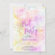 Faites un splash avec notre cool feuille de palmier tropicale des invitations Sweet 16 anniversaire! Doté d'une palme blanche modifiable illustrations feuilles sur l'arc-en-ciel pastel watercolor wash unicorn thème avec une amusante police et le coeur de script de brosse moderne. . Parfait pour une fête de 16 ans ou toute fête d'été.