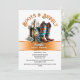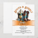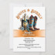 Une paire de bottes en cuir marron avec incrustations orange et bleu turquoise est accompagnée d'une bouteille de vin mousseux orange pâle et d'un faux or, reposant sur une bande horizontale orange et faux or contre un arrière - plan blanc. Les modèles de texte orange, noir et blanc modifiables peuvent être personnalisés pour convenir à votre célébration spéciale. Cet invitation téléchargeable élégant est idéal pour un événement spécial sur le thème occidental, "bottes et bling" de pays ou "bottes et bulles" aussi.