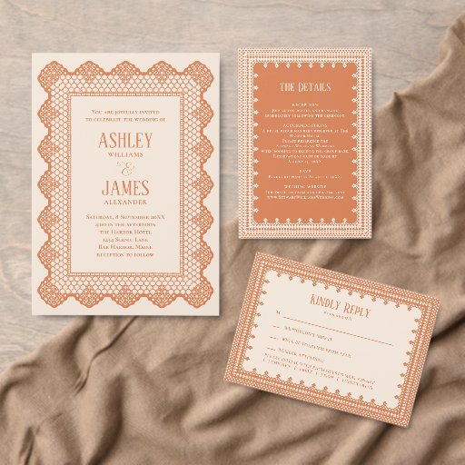 Delicate and romantic, this peach lace border wedding invitation features an elegant lacy frame in a soft, warm peach palette. The intricate border detail adds a timeless, heirloom feel while keeping the overall design refined and graceful. Perfect for classic, vintage-inspired, or garden weddings, this invitation sets a beautifully sophisticated tone for your special day. Fully customizable with your names, date, and wedding details.