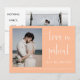 Cette faire-part d'élévation mariage comprend une calligraphie élégante et une police de typographie sans serif simple avec des photos sur un arrière - plan pêche pour un look épuré minimaliste et moderne, ce qui est une belle façon d'informer sur votre mariage à venir. Annoncez à votre famille et à vos amis qui viennent d'être mariés avec cette invitation et ajoutez une touche personnelle avec de belles photos de vous et de votre moitié meilleure. La simplicité de ce design ajoute une touche d'élégance à votre faire-part mariage. Il fonctionne bien avec de nombreux thèmes mariages et certainement un grand ajout à votre mariage. Il suffit de customiser les noms et le libellé en quelques étapes simples et personnalisez la carte d'invitation faire-part avec vos photos du couple heureux. Veuillez noter : La calligraphie élégante de l'expression "L'amour est patient mais nous ne le sommes pas" et "rien de fantaisie juste l'amour" ainsi que les lignes et d'autres illustrations graphiques et éléments ne peuvent pas être modifiés, supprimés, ou déplacés. Elles sont réparées. Si vous devez modifier la couleur, vous pouvez customiser la carte d'invitation. Vous pouvez customiser et personnaliser l'invitation afin de répondre à vos besoins mariages et cliquez simplement sur personnaliser de l'invitation. Vous pouvez facilement personnaliser l'invitation avec le texte comme un téléchargement numérique et l'envoyer électroniquement et le partager avec vos invités par SMS, email, ou médias sociaux. Ou vous pouvez également choisir de poster l'invitation concernant vos détails à vos invités. Ou vous pouvez obtenir les deux — invitation imprimée et obtenir l'invitation sous forme numérique en téléchargement instantané.