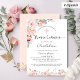 Belle aquarelle fleurie Première communion invitation en espagnol, avec arrangement floral exquis sur le coin supérieur gauche et champ de fleurs sur la section du fond de la carte avec des fleurs dans des tons rose pâle et délicats avec détails de parties scintillant or rose et la verdure menthe. Même invitation également disponible en anglais. La carte est de retour dans l'ombre de pêche rousse avec détails de fleurs sur le fond. Invitation avec section pour les détails "Cérémonie" et "Réception". Une partie de notre collection "Mint Elegance" mariage et événements.