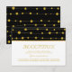 Carte de réception de mariage moderne à rayures et perles de papier d'aluminium noir et or avec un motif de ficelle avec des boules de papier d'aluminium or avec une brillance métallique sur le dessus qui ressemblent à des perles sur une corde et une rayure dorée sur fond noir et vos détails sur fond blanc. Ce design de modèle de mariage élégant et stylé est entièrement personnalisable et est parfait pour un mariage contemporain. Notez qu'IL N'Y A PAS DE VRAI PAPIER D'ALUMINIUM OR, SEULEMENT DES IMAGES IMPRIMÉES.