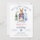 Peter rabbit thème d'hiver fête d'anniversaire modèle invitation téléchargement numérique, un lapin mignon dans une veste bleue et écharpe rouge debout par des pins enneigés et des flocons de neige pour les fonctions hivernales.