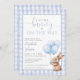 Cette charmante invitation au baby shower comporte un mignon petit lapin tenant des ballons et un arrière - plan bleu en vichy. Conçu par Thisisnotme©