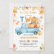 Jolie invitation d'anniversaire en style. Thème : Citrouille Patch Blue Truck Occasion : Baby Boy 2nd Birthday Party. Style : Mignonne, Gaie, Amusante. Couleurs : orange, bleu, or, blanc. Graphiques : Camion de ferme bleu aquarelle, citrouilles, feuilles d'automne.