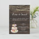 Trois niveaux de desserts sucrés sur un fond en bois rustique merveilleusement complété par des lumières féeriques et une belle calligraphie.