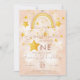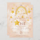 Invitation au premier anniversaire arc-en-ciel bohème dans des tons rose pastel, poussière magique et étoiles dorées brillantes. Cliquez sur le bouton "personnaliser davantage" si vous souhaitez réorganiser et formater le style et l'emplacement du texte.