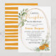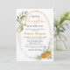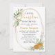 Invitation à une baby shower de verdure d'automne avec un fond blanc élégant qui peut être changé en n'importe quelle couleur, un cadre doré faux rustique, un beau feuillage vert aquarelle, des accents de paillettes dorées, des citrouilles d'automne orange et un modèle de célébration de baby shower facile à personnaliser.