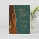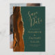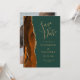 Cette élégante carte de date moderne dispose d'une bordure de géode d'aquarelle orange brûlée et bordée de parties scintillant en faux or. Le texte de couleur or apparaît sur un arrière - plan vert foncé. Remplacez facilement l'image de l'image de l'envers par votre photo verticale préférée.