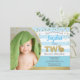 Invitation photo de fête thème lapin mignon bleu et or pour les 2 ans du bébé garçon.