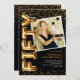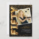 Invitation moderne de 50ème anniversaire avec un arrière - plan noir élégant, un modèle photo à remplacer par le vôtre, une diffusion de confettis de parties scintillant d'or, ballons d'hélium d'or qui épellent "cinquante", et un élégant modèle de texte de fête qui est facile à personnaliser.