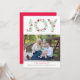 Cette carte de vacances présente une illustration botanique du mot JOY en rouges et verts vifs. Personnalisez avec votre propre photo, nom et un message personnalisé. le verso de la carte est d'un rouge riche. Image de remplacement par Katie Soyka Photography.