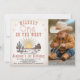 Cute boy's safari western, rodeo, cowboy or wild west themed first birthday invitation featuring a western sunset desert image, aged paper background and a western style font. This cute boy's widest one in the west 1st birthday invitation also features a photo on the right hand side and is ideal for a cowboy themed first birthday party.