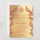 Cette élégante invitation de mariage comporte une photo ronde entourée de branches rouges en fleurs de cerisiers et un noeud doré sans fin sur un arrière - plan doré. Noms de mariée et de mariée dans un élégant script classique.