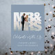 Élégant étage bleu poussiéreux, faire-part de mariage privé et invitation à la réception post-mariage avec votre photo est dans un cadre "Mr & Mrs", "Celebrate With Us" dans un script blanc moderne et vos noms, date mariage et emplacement dans une simple typographie blanche. À l'arrière, personnalisez votre mariage ou votre faire-part d'elopement et l'invitation à la réception, et ajoutez vos noms mariés dans un script blanc signature.
