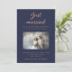 Cette invitation moderne de brunch d'après-mariage bleu marine comporte votre photo de mariage personnelle préférée, avec une écriture manuscrite rose gold faussement fantaisiste et classique qui dit "juste mariés" pour un look élégant que vous aimerez.