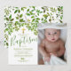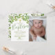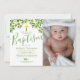 Cartes d'invitation au baptême neutres en genre avec un fond blanc classique pouvant être changé en n'importe quelle couleur, des branches d'arbre à l'aquarelle avec un feuillage vert luxuriant, une croix dorée religieuse, une photo de votre enfant et un modèle de texte moderne facile à personnaliser.