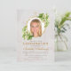 Cette élégante invitation de confirmation pour fille comporte une photo de fille générique dans un cadre doré irrégulier avec des bouquets de fleurs d'orchidées blanches et roses en haut à droite et en bas à gauche sur deux hexagones dorés qui se chevauchent, avec une croix dorée en haut.