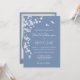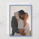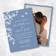 Ce faire-part de mariage floral bleu poussiéreux présente des branches de fleurs de cerisier sur un arrière - plan bleu poussiéreux. Avec des noms de mariés et de mariés dans un élégant script manuscrit. Ta photo à l'arrière.