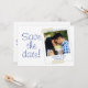Ce style de photo branché enregistrer la carte d'annonce de date présente la photo du couple entourée d'un cadre blanc. Un dessin de ruban de masquage se trouve au-dessus et au-dessous de la photo. Une police de style d'écriture manuscrite est utilisée sur la carte. La couleur de la police est bleue.
