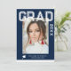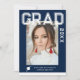 Photo Graduation Party Elégant Modern Script Invitations comprennent votre photo préférée avec le texte blanc simple "Grad (année)" et votre nom et les détails de graduation personnalisée sur le devant sur un arrière - plan bleu. Au verso, ajoutez une image supplémentaire avec les informations sur l'invitation de graduation ci-dessous. Personnalisez en modifiant le texte dans les zones de texte fournies. Créé par ©Evco Studio www.zazzle.com/store/evcostudio