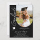 Photo Graduation Party Modern Elegant Script Invitations présente votre photo préférée avec le texte "Graduate" dans élégant script de calligraphie typographie sur un arrière - plan noir. Ajoutez ci-dessous les informations sur l'invitation à passer votre diplôme. Personnalisez en modifiant le texte dans les zones de texte fournies. Envoyer comme un téléchargement numérique instantané, comme une invitation physique par courrier ou les deux. Créé par ©2025 Evco Studio www.zazzle.com/store/evcostudio